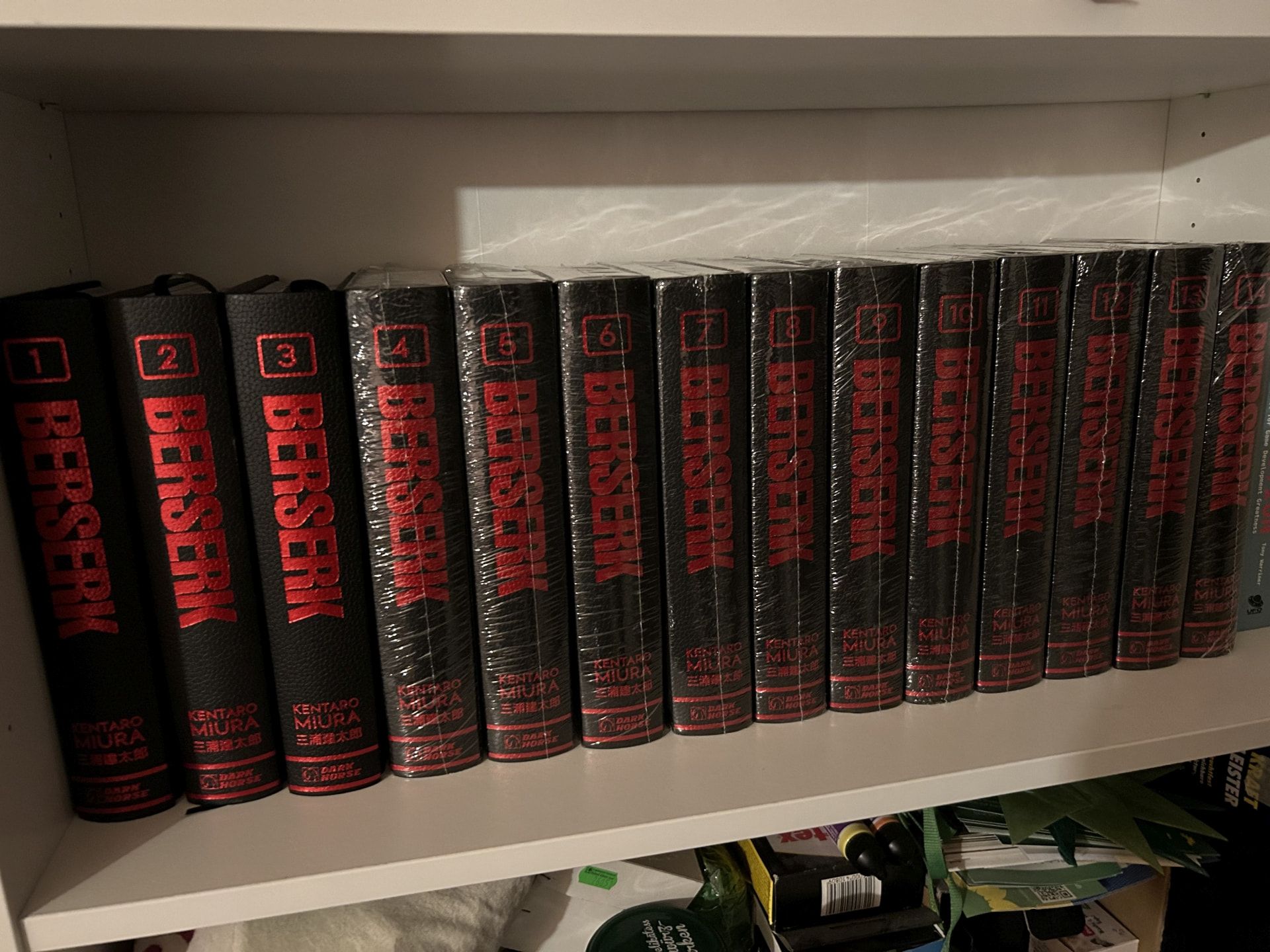 Amazon aufgemacht, Berserk gesucht, hm, zu viel Auswahl. Zu Thalia gewechselt. Da gibt es 14 Bände, um die 55 Euro. Happig. Aber immerhin wohl als Deluxe-Version? Macht sich vielleicht gut im Schrank – irgendwie muss man ja den gemeinen Gast beeindrucken … also zack, Berserk Deluxe Band 1–3 bestellt und gewartet. Es klingelt, komisch – so groß, so schwer das Paket? Wow, 14 Stück davon im Regal? Ich dachte, Comics sind dünn und leicht. Pustekuchen. Aber gut, lesen wir mal rein – aber erst mal das Buch umdrehen (siehe Irritationsfaktor 1, oben).