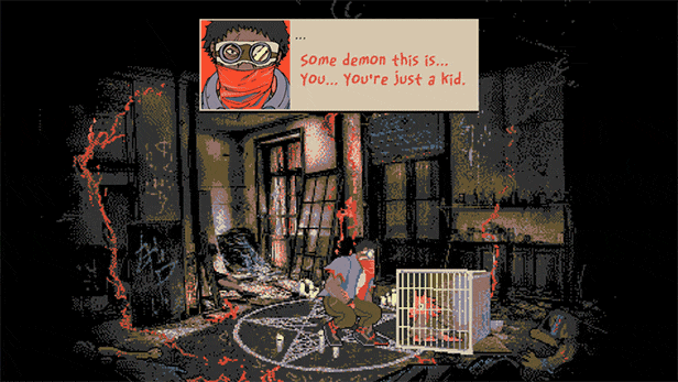 Bevor wir etwas von der Story begreifen, schlängelt sich der eindrucksvolle Grafik-Stil gekonnt in den Vordergrund. Die Szenerie ist mit pixeligen Schablonen besetzt und geht im Hintergrund in reine Pixel-Art über. Neben den gedämpften Landschaftstönen gleißt ein grelles Orange Risse ins Bild und akzentuiert das Ödland. Gerne würde ich den Schaffensprozess begreifen; ich denke, viele Texturen sind herunterskalierte Originalaufnahmen, die anschließend verschrofft wurden. Dazwischen allerhand Selbstgezeichnetes. Gekonnt mischt es sich ineinander, aber erstmal weiter zum Beschwörungshaus des Untergangs.