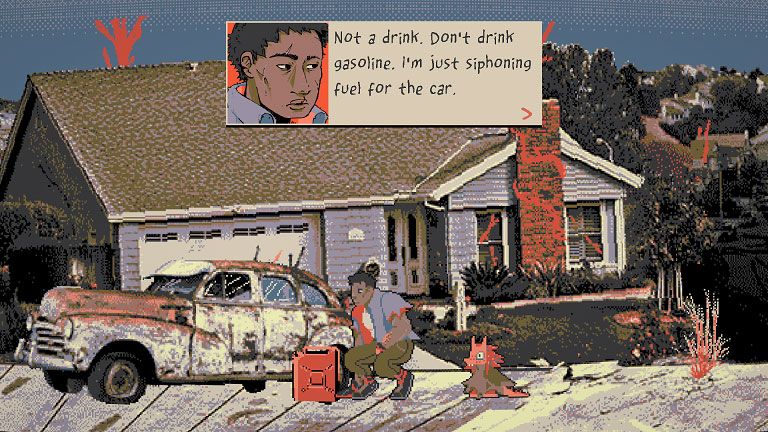 Die Dialoge zwischen Del und Barrett tragen den Großteil der Handlung – sie sind flockig geschrieben und entfalten Dynamik zwischen den beiden. Abgelöst werden die Gespräche durch die steuerbaren Szenen. Wir manövrieren Del aus der 2D-Perspektive und ergattern in kleinen Minispielen Vorräte aus den angebrochenen Resten der Zivilisation. Oberste Priorität hat die Versorgung; Nahrung ist Überleben. Abgelenkt von den einzigartigen Grafiken bleibe ich öfters staunend stehen. Das Ganze wirkt wie eine Collage aus erkennbaren Objekten und zerwürfelter Distanz. Die Schatten pixeln vor sich hin und treffen die Stellen ins Schwarze. Animationen liegen flüssig darüber und auch die Dialogfenster samt Comic-Zeichnungen von Del und Barrett harmonisieren. In Sachen Style erscheint „Fostering Apocalypse“ von Incisor Studios prächtig.