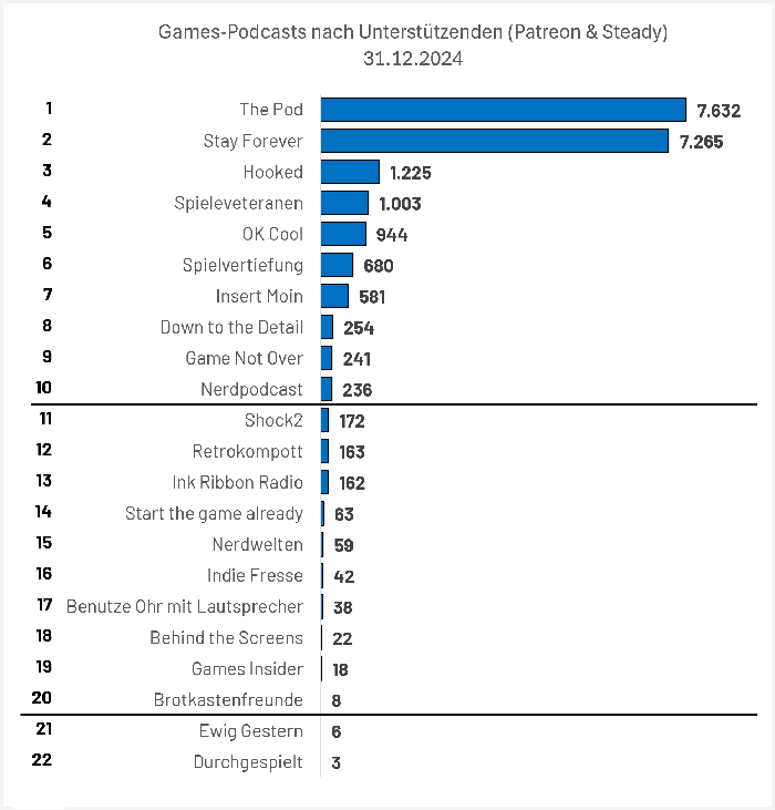 Um den Umfang zu begrenzen, wird in diesem Beitrag nur der Raum der deutschen Spielepodcasts betrachtet – und hier explizit nur ThePod und StayForever. Zudem sind kaum auswertbare Daten öffentlich verfügbar. Aussagen über das Wachstum von Projekten beziehen sich daher ausdrücklich nur auf mündlich übermittelte Werte in etwaigen Podcasts, sowie auf persönlichen Beobachtungen.